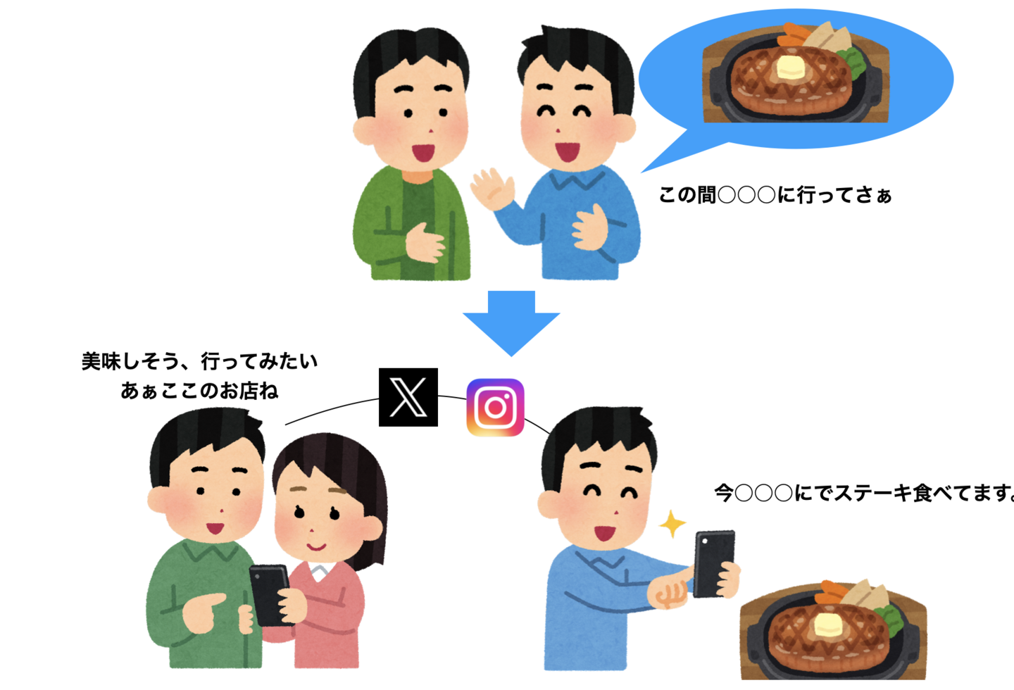 これまでは、どこかで食事をしても後日誰かに話すという流れでしたが、